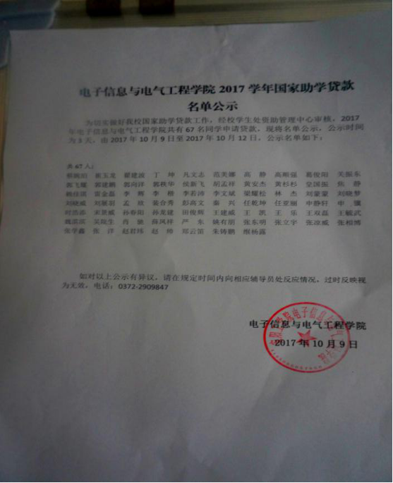 为切实做好公司国家助学贷款工作,经校员工处资助管理中心审核,2017年bevictor伟德官网共有67名同学申请贷款,现将名单公示,公示时间为3天,由2017年10月9日至2017年10月12日,公示名单如下: