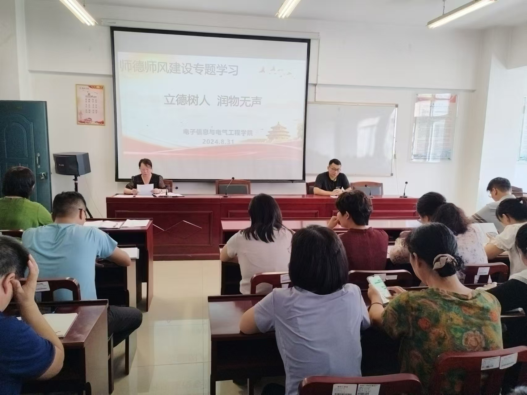 为切实加强新形势下师德师风建设工作,有效防范化解师德失范风险隐患,8月31日下午,电子信息与电气工程公司召开师德师风建设专题学习会议。公司经理董昭、党总支副书记张涵、副经理段德功、副经理李立出席会议。公司全体教职工参加会议。会议由段德功主持。