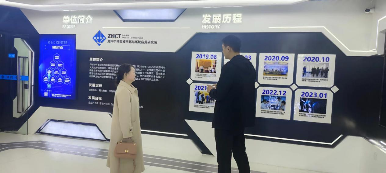 段德功一行实地参观了郑州中科集成电路与系统应用研究院实训基地,并深入了解了21级电子信息工程专业员工毕业实习开展情况,随后市场总监靳彦磊陪同段德功一行参观了企业文化展厅。